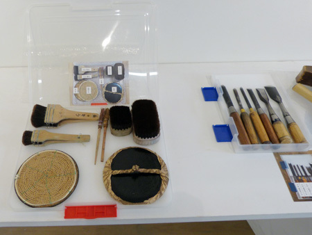 摺りでは、一文字ぼかし(天ぼかし)、当て無しぼかし、拭き上げぼかし・拭き下げぼかしを行う等、伝統技術を学ぶ事が出来ます。