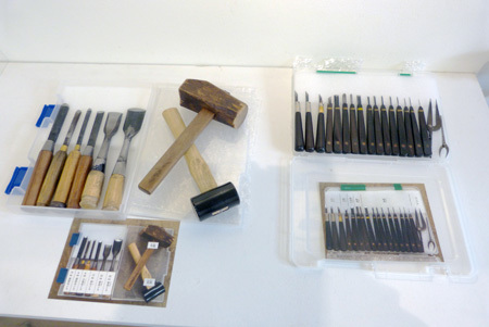 お教室では、江戸時代から伝統を受け継いでいる技術者(職人)と同じ浄瑠璃文字や、鹿の子模様を彫る稽古を行います。そして生徒の希望により、自分の描いた絵の木版画や、歌麿、写楽の役者絵・美人画、北斎や広重の風景画等の復刻木版画作品作りに励んでいます。