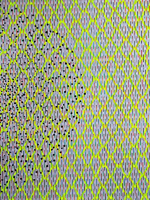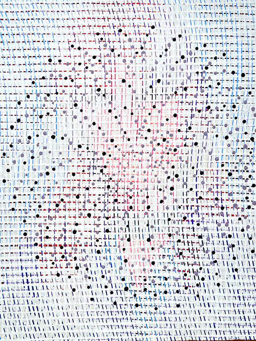 1枚のキャンバスに「リセット」と「記憶」の共存をテーマとしました。写真や資料を参照してマスキングテープが貼られたキャンバスに亡くなった人を描き、マスキングテープを剥がすことで描いたイメージをリセットし、絵と余白を均衡させる試みでした。しかしながら最終的に満足できる成果は得られませんでした。絵は放置されていましが、2022年ロシアのウクライナ侵攻における報道を見てから、私が描いた亡くなった人とはウクライナの人かもしれないと思うようになりました。私はその絵に花火を描きました。